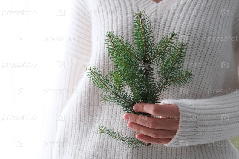 Елка в руках у девушки в белом вязаном свитере. Минимализм. Уютная зима, Новый год