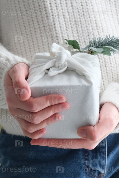 Упаковка подарков в ткань на рождество в стиле фурошики. Экологически чистая концепция. Сделай сам