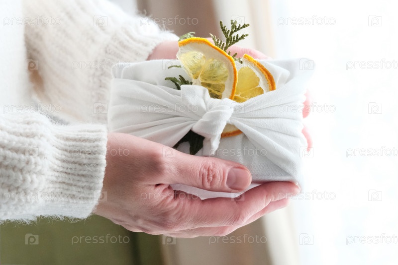 Упаковка подарков в ткань на рождество в стиле фурошики. Экологически чистая концепция. Сделай сам