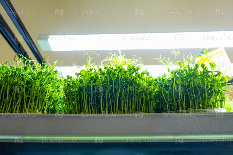 Горох. Городская ферма по выращиванию микрозелени. Экологичный малый бизнес. детские листья, фитолампа