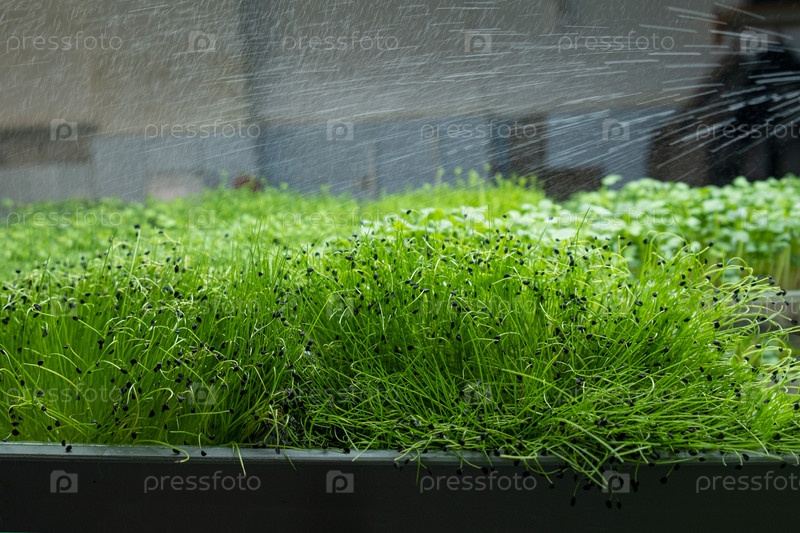 Зеленые листья лука, выращенного на микроферме агропонным методом. лук микрозелень. полив,