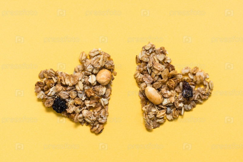 Любовь к здоровой пище. Гранола из овса, орехов и изюма в виде двух сердец на желтом фоне. Вид сверху