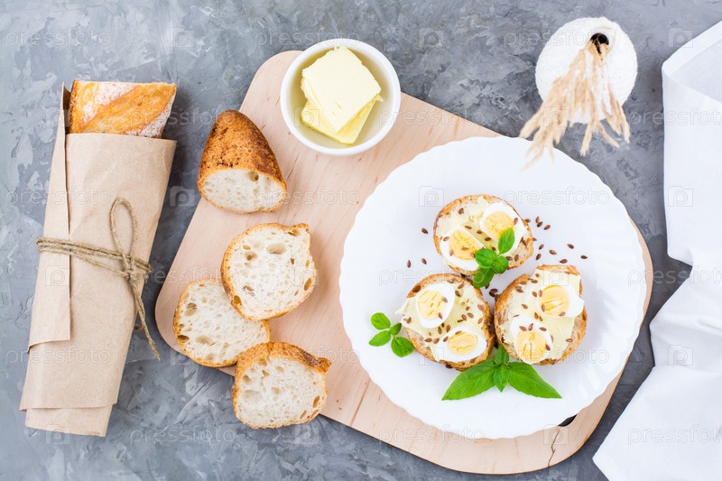Утром плотный завтрак. Свежие бутерброды с багетом с маслом, перепелиными яйцами, семенами льна и семенами базилика на тарелке на столе. Вид сверху