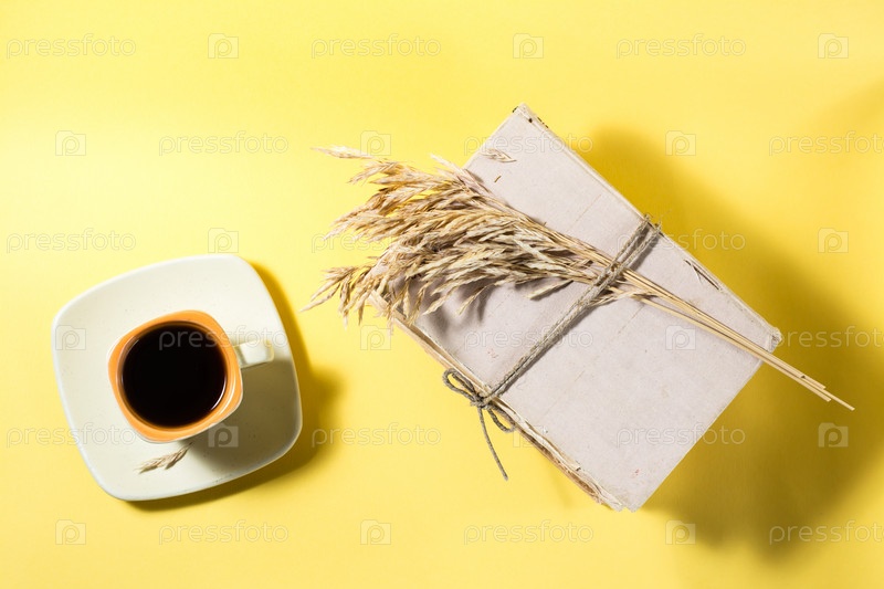 Чашка кофе, старые книги и сухие початки кукурузы в желтом и жестком свете. Оздоровление, гармония, инклюзивность. Вид сверху