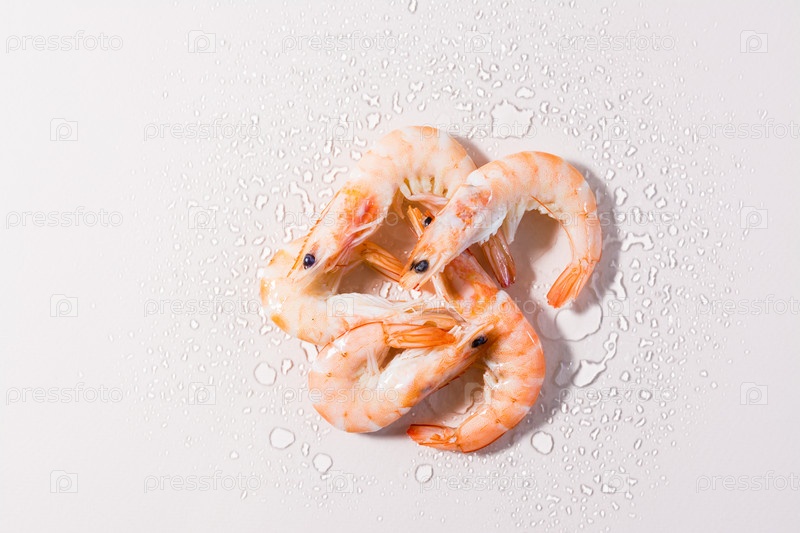 Сырые размороженные креветки с каплями воды на розовом фоне. Средиземноморская кухня. Жесткий свет. Вид сверху