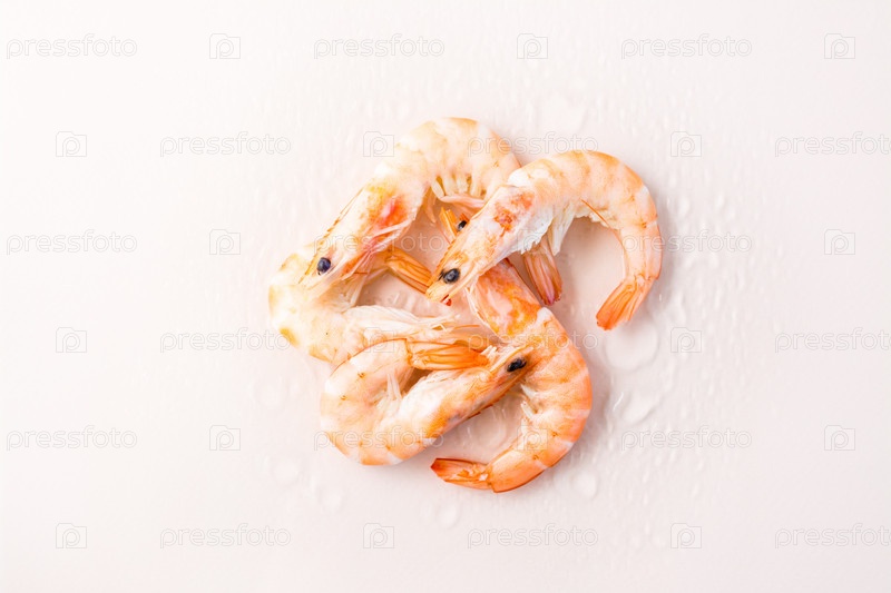 Сырые размороженные креветки с каплями воды на розовом фоне. Средиземноморская кухня. Вид сверху