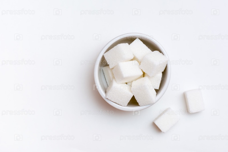 Белые кубики сахара в миске на белом фоне. Вид сверху