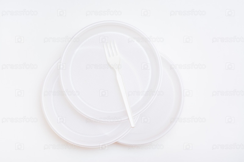 Три белые одноразовые чистые пластиковые тарелки и вилка на них на белом фоне. Вид сверху