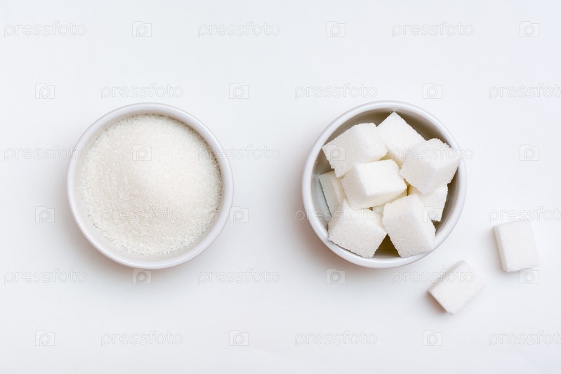 Выбор между сахарным песком и кубиками сахара в мисках на белом фоне. Вид сверху