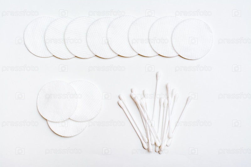 Чистые ватные диски и ватные тампоны для удаления косметики на белом фоне. Вид сверху