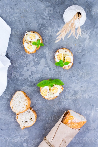 Утром плотный завтрак. Свежие бутерброды с багетом с маслом, перепелиными яйцами, семенами льна и семенами базилика на столе. Вертикальный вид. Вид сверху