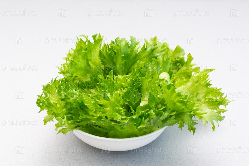 Свежие зеленые листья салата в миске на столе. Здоровое питание
