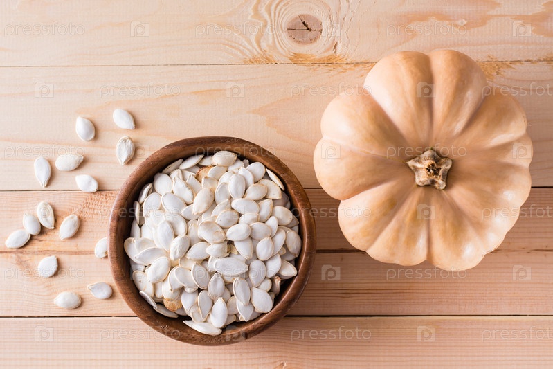 Жареные тыквенные семечки в тарелке и тыква на деревянном столе. Вид сверху