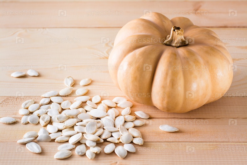 Жареные неочищенные тыквенные семечки и тыква на деревянном столе