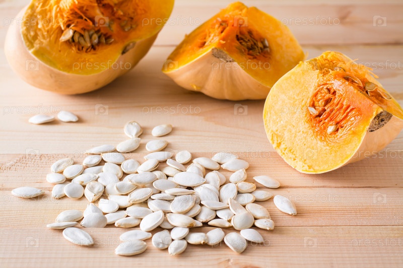 Жареные неочищенные тыквенные семечки и ломтики тыквы на деревянном столе
