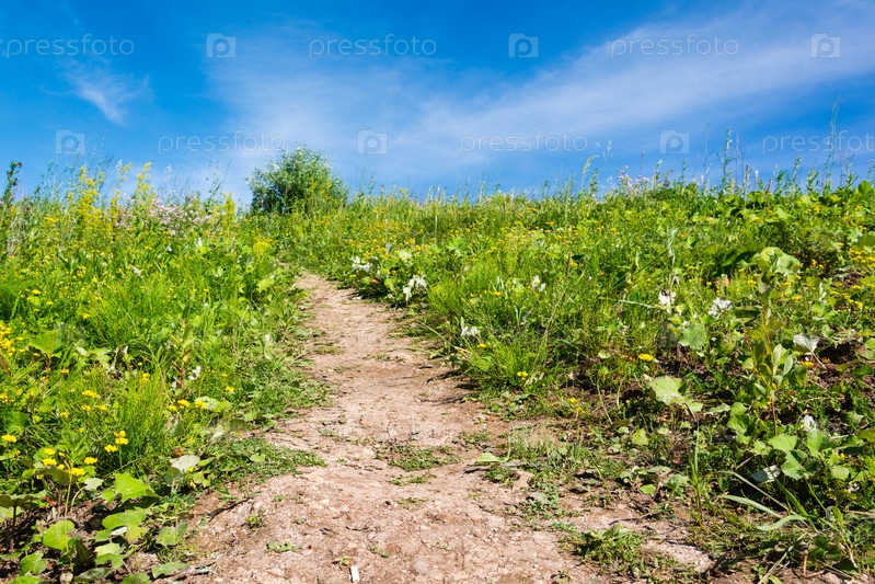 Грунтовая дорожка, обрамленная зеленой травой, поднимается к голубому небу. Концепция развития