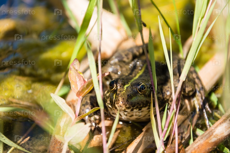 Большая спокойная лягушка сидит в траве у пруда. Медленная животная жизнь