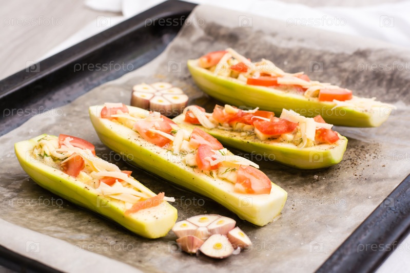 Половинки сырых кабачков, готовые к запеканию, фаршированные сыром и помидорами на бумаге для выпечки на противне. Овощные блюда, здоровое питание