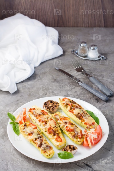 Готовые к употреблению запеченные половинки цуккини, фаршированные сыром, помидорами и листьями базилика на тарелке на столе. Овощные блюда, здоровое питание. Вертикальный вид