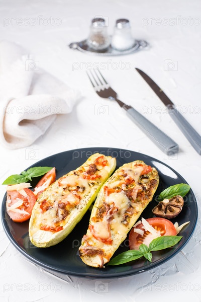 Готовые к употреблению запеченные половинки цуккини с начинкой из сыра, помидоров и листьев базилика и столовые приборы на черной тарелке на белом столе. Овощное меню, здоровое питание. Вертикальный вид