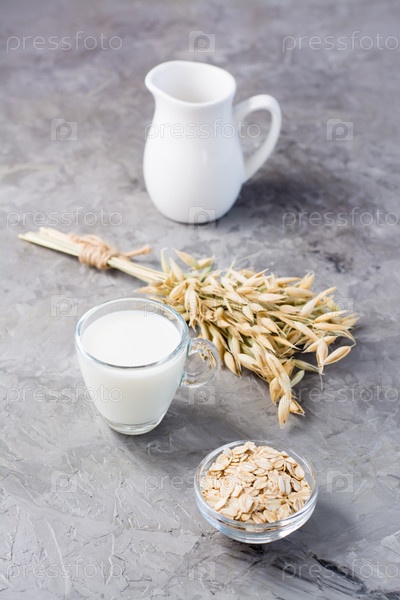 Овсяное молоко в чашке, овсянка и кукурузные початки на столе. Альтернатива коровьему молоку. Здоровое питание. Вертикальный вид