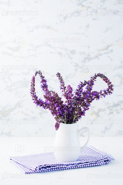 Букет свежей ароматной лаванды в белом кувшине на столе. Белый и фиолетовый цвета. Украшение дома. Скопируйте пространство. Вертикальный вид