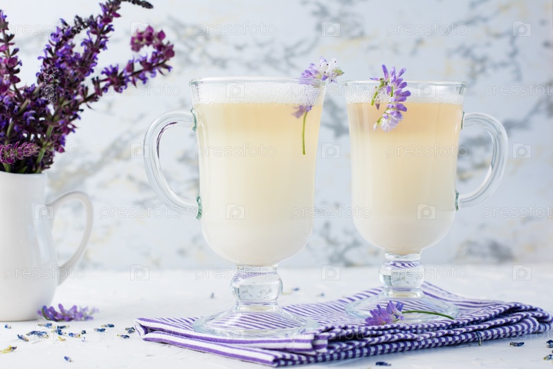 Латте с молоком, пеной и лавандой в стаканах и букет цветов в кувшине на белом столе. Ароматный кофе
