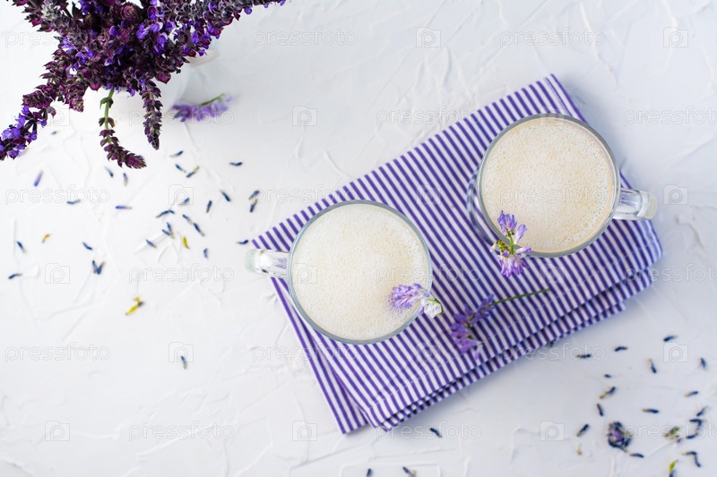 Латте с молоком, пеной и лавандой в стаканах и букет цветов в кувшине на белом столе. Ароматный кофе. Вид сверху. Копировать пространство
