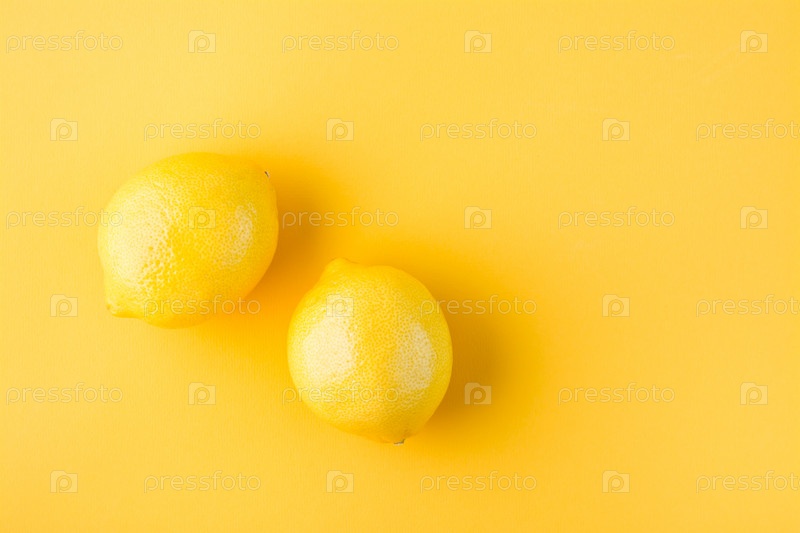 Два спелых целых лимона на желтом фоне. Детокс фруктовая диета, детоксикация организма. Вид сверху