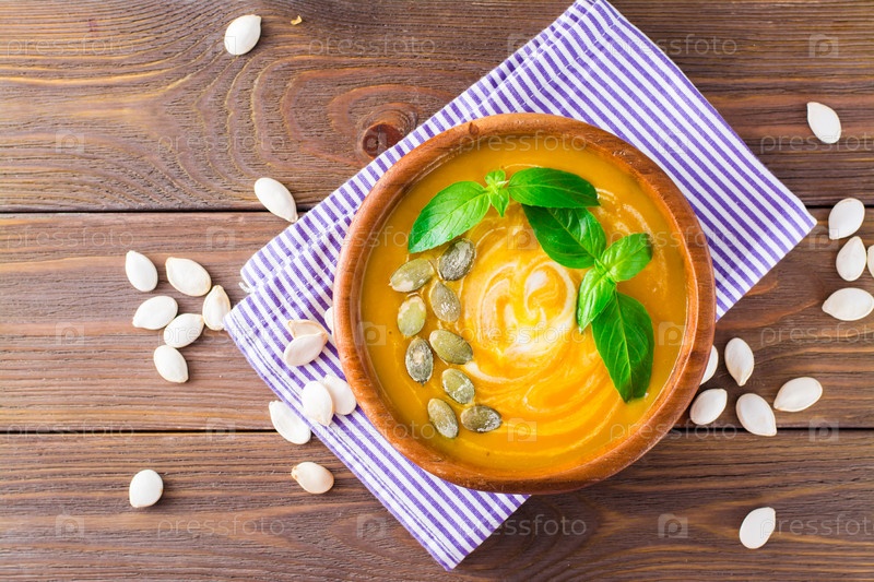 Вид сверху на вегетарианский осенний суп-пюре из тыквы с семенами и сливками в деревянной тарелке на столе