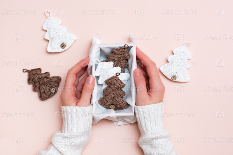 Рождество ручной работы. Вязаные елки в подарочной коробке в женских руках на пастельном фоне. Рукоделие и отдых