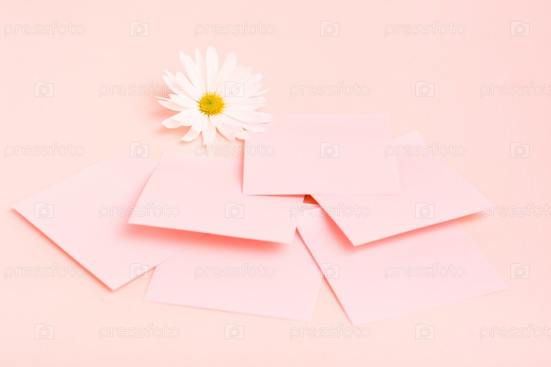 Концепция розовая. Пустые квадратные маленькие листы для письма и хризантемы на розовом фоне