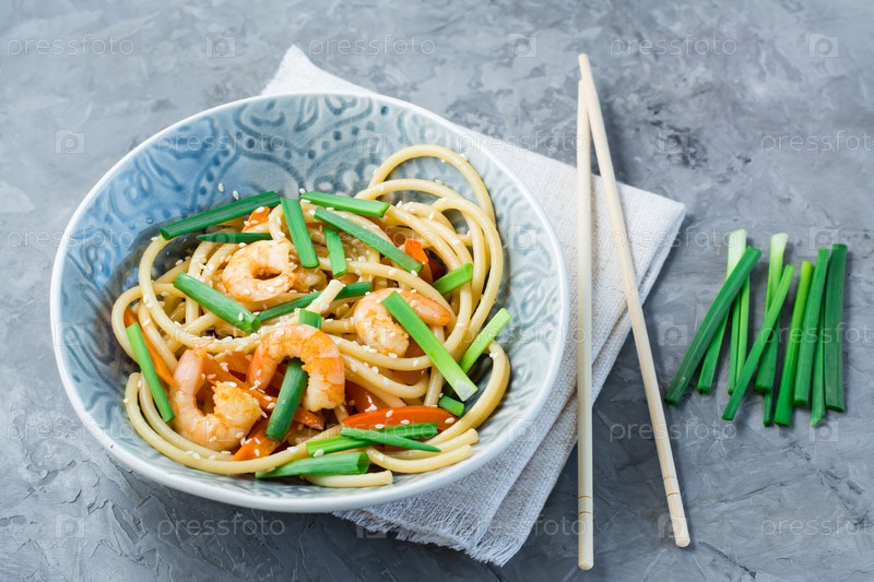 Лапша удон и вок с креветками, перцем и луком в тарелке на салфетке и палочками на столе. китайская еда
