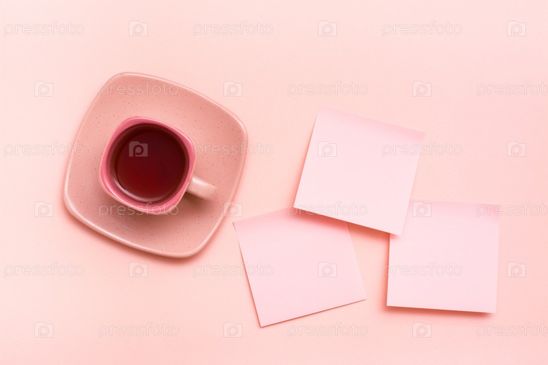 Концепция розовая. Розовый напиток в кофейной чашке и листы для письма на розовом фоне. Вид сверху
