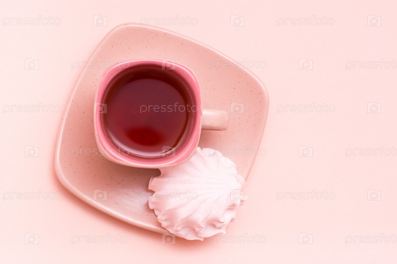Концепция розовая. Розовый напиток в кофейной чашке и зефир на блюдце на розовом фоне. Вид сверху