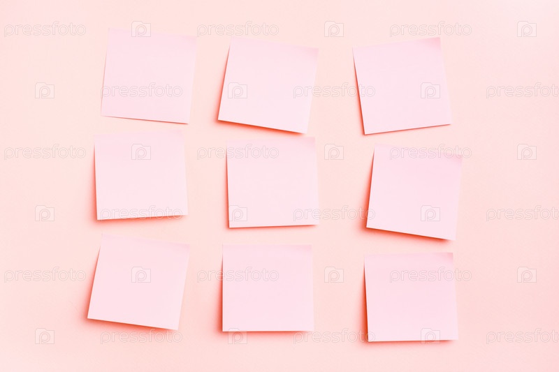 Концепция розовая. Чистые квадратные маленькие листы бумаги для написания ровными рядами на розовом фоне. Вид сверху