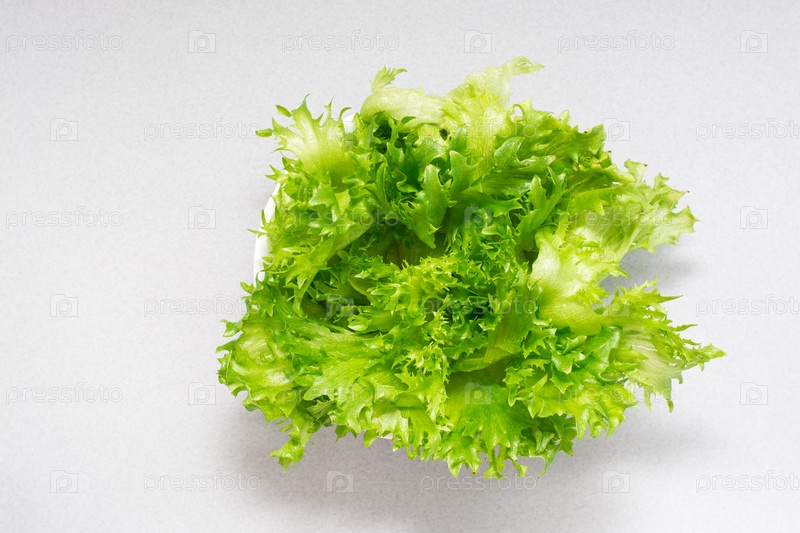 Свежие зеленые листья салата в миске на столе. Здоровое питание. Вид сверху