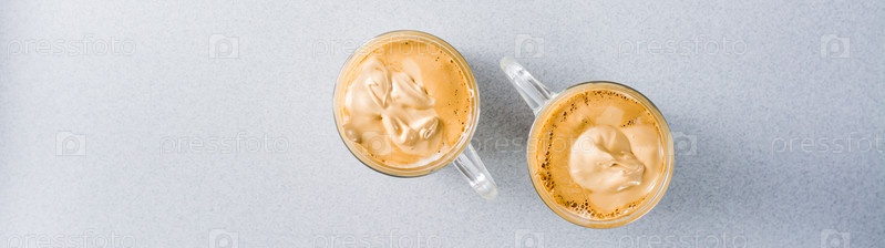 Две чашки с кофе далгона на столе. Карантинная кухня. Скопируйте пространство. Вид сверху. Веб-баннер