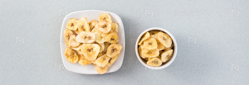 Запеченные банановые чипсы в белой миске и блюдце на столе. Быстрое питание. Веб-баннер. Вид сверху