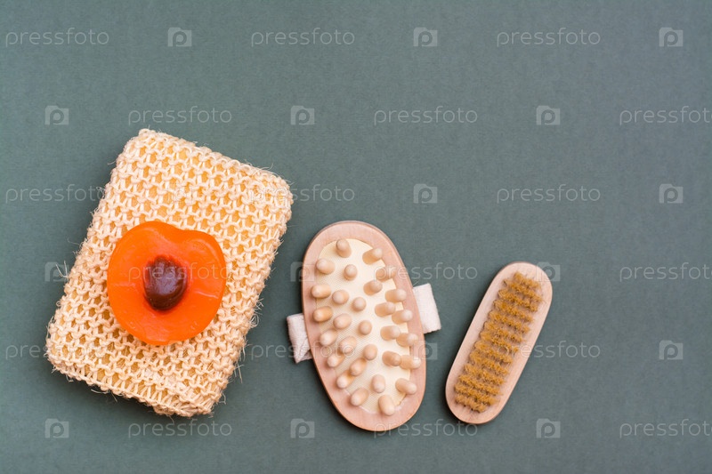 Уход за телом. Мочалка, щетка, массажер и мыло ручной работы на зеленом фоне