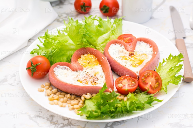 Романтический завтрак. Жареные яйца в сосисках в форме сердца, листья салата и помидоры черри на тарелке на столе. Крупный план