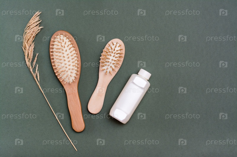 Уход за волосами. Две деревянные расчески, бутылка шампуня и уши трав на зеленом фоне