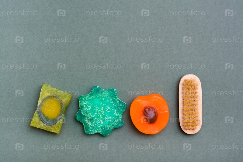 Уход за телом. Различные виды мыла ручной работы без добавок и кисти на зеленом фоне