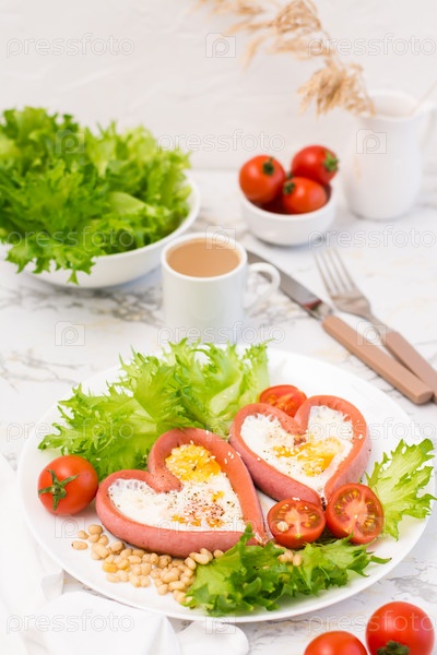Люблю завтрак. Жареные яйца в сосисках в форме сердца, листья салата и помидоры черри на тарелке и чашка кофе на столе. Вертикальный вид