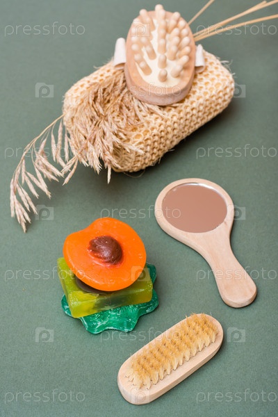 Уход за телом. Различные виды мыла ручной работы без добавок, мочалки, массажера и щетки на зеленом фоне. Вертикальный вид