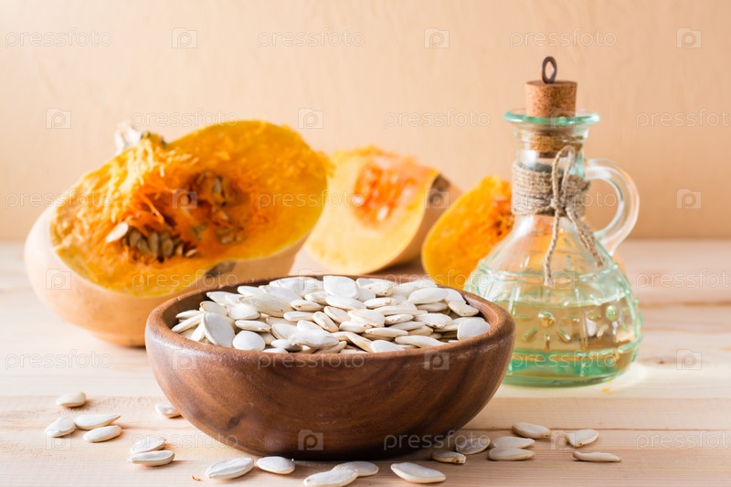 Жареные неочищенные семена тыквы в тарелке, масло в бутылке и кусочки тыквы на деревянном столе. Здоровое питание