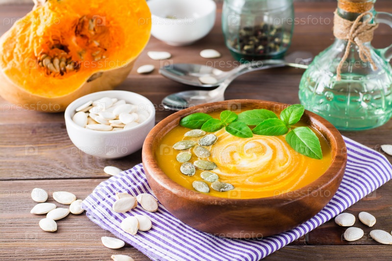 Вегетарианский осенний суп-пюре из тыквы с семечками и сливками в деревянной тарелке на столе