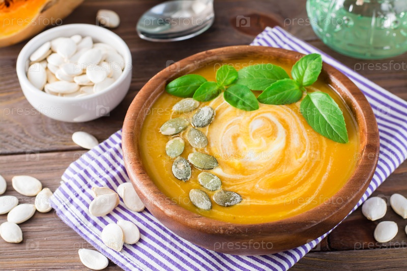 Крупный план вегетарианского осеннего тыквенного супа-пюре с семенами и сливками в деревянной тарелке на столе