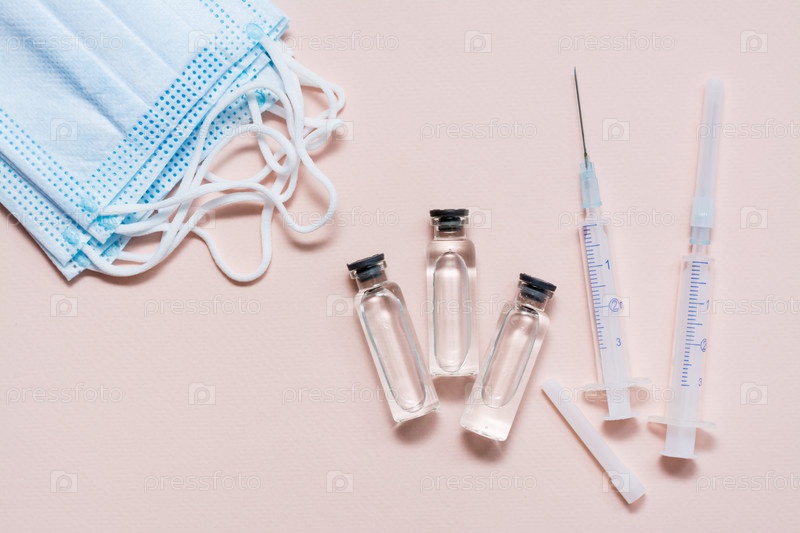 Вакцинация и иммунизация. Чистые шприцы, стеклянный флакон с вакциной и защитные маски для лица. Вид сверху