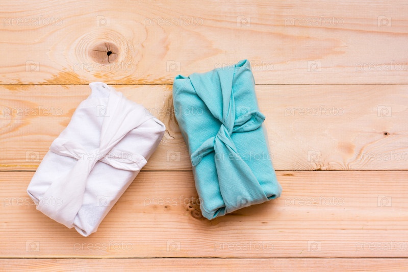 Фурошики экологически чистые подарки, завернутые в ткань на деревянном фоне. Ноль отходов. Вид сверху